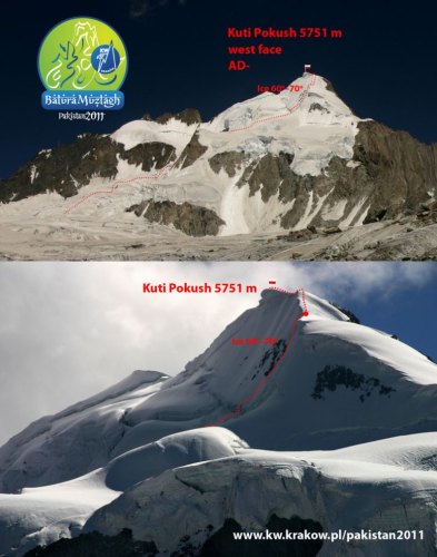 Celem aklimatyzacyjnym był wierzchołek Kuti Pokush, który - nie licząc naszej wspinaczki - był już dwukrotnie zdobyty z innej doliny. W trakcie wspinaczki wytyczyliśmy nową drogę na wierzchołek. W skali alpejskiej wyceniliśmy tą drogę na AD- (trudno), lód ok. 50 stopni (160 m), podejście stromym lodowcem. Góra doczekała się pierwszego polskiego wejścia.