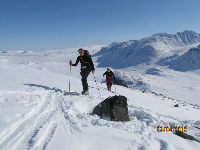 Po 5 godzinnym marszu docieramy pod wierzchołek, lecz na sam szczyt już nie da się wyjść na nartach, ostatnie kilka metrów pokonujemy w samych butach. Szczyt Sarvatjahkka nie jest osłonięty żadną inną górą dzięki czemu podziwialiśmy panoramę na odległe dziewicze wierzchołki w parku Sarek. Cała ekipa, tj. Natalia, Mariusz, Wojtek, Daniel i Maciek wyszła na szczyt bezproblemowo. Po kilku chwilach spędzonych na szczycie, zaczęło się to na co każdy z nas czekał z niecierpliwością czyli wspaniały zjazd po świeżutkim puchu.
