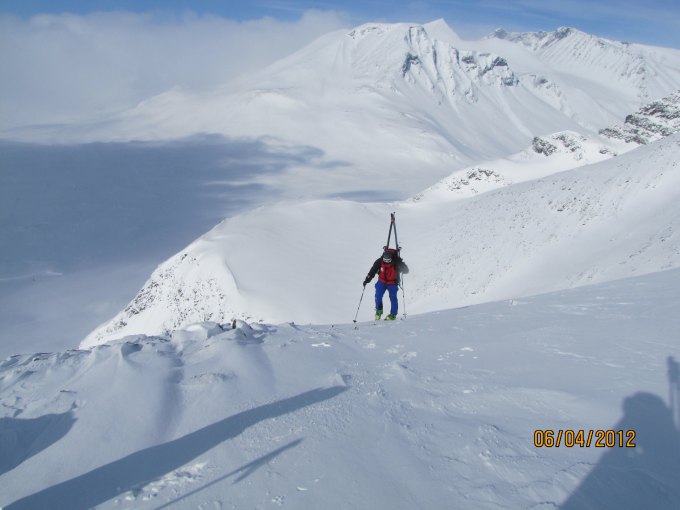 Późnym popołudniem wypogodziło się, więc najbardziej wytrwali, tj. Wojtek i Daniel ubrali sprzęt ski-tourowy i wyszli na kolejny pobliski szczyt Nasaket. Końcówkę podejścia pokonali z nartami przypiętymi do plecaków, oczywiście później zaliczyli kolejny zjazd w puchu.