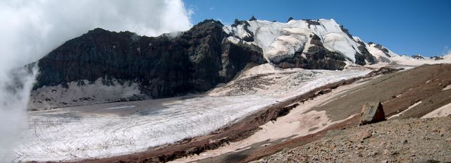 Następnego dnia, z samego rana, ruszyliśmy w kierunku wzgórza Gergeti (2080 m), na wierzchołku którego znajdował się malowniczy Kościół Świętej Trójcy. Od tego miejsca posuwając się na południowy-zachód dotarliśmy do olbrzymiego czoła lodowca. Po przekroczeniu wartkiej rzeki, spływającej kaskadami z wielkich naniesionych głazów, wkroczyliśmy w świat lodowych szczelin. Gwałtowne załamanie pogody, tak typowe dla tego regionu, bardzo szybko sprawiło, że po raz kolejny zgubiliśmy się w trakcie podejścia. Nasz cel, Stacja Meteo (3600 m) była blisko, czuliśmy to, ale zapadający zmrok, silny wiatr i gęste chmury sprawiły, że błądziliśmy przez kolejne kilka godzin.