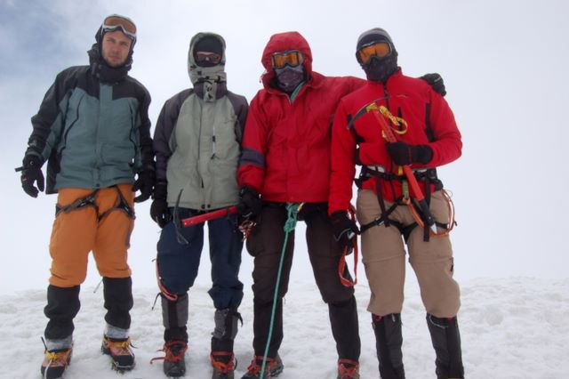 Na przełęczy między dwoma wierzchołkami Kazbeka, ostatnie 50 m stromej, śnieżno-lodowej ściany (około 45-50 stopni nachylenia) wyprowadziło nas na upragniony wierzchołek. Kazbek został zdobyty - ostatecznie.