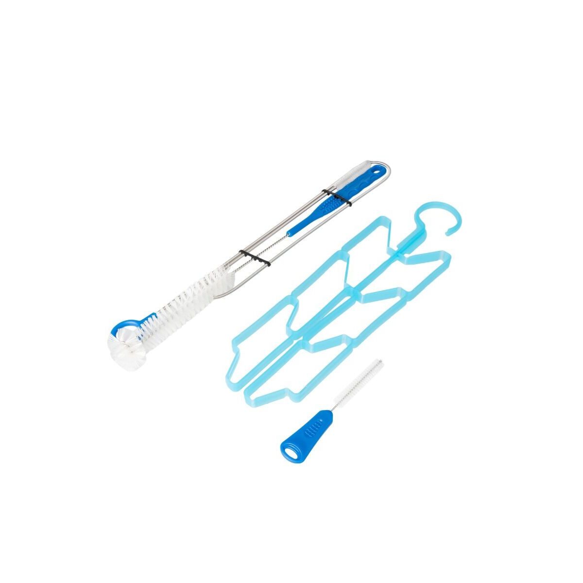 W jego skład wchodzi wieszak do suszenia, dwie szczotki oraz wycior, które umożliwiają dokładne wyczyszczenie zarówno wnętrza bukłaka, jak i trudno dostępnych miejsc w rurce. Komplet został zaprojektowany tak, by był lekki, kompaktowy i łatwy do spakowania, dzięki czemu bez problemu można zabrać go ze sobą w każdą podróż.