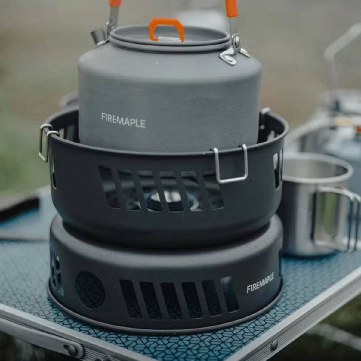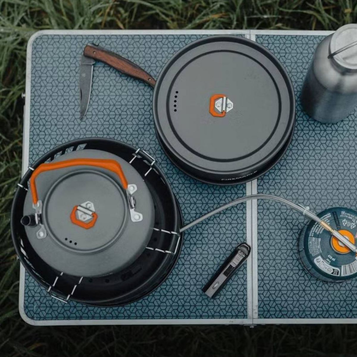 - Zestaw do gotowania w plenerze składający się z palnika gazowego, 2 garnków, patelni, czajnika i chwytaka