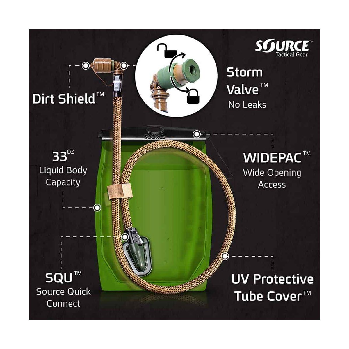 - zawór do picia połączony z szybkozłączem umożliwia szybkie podłączenie akcesoriów, takich jak adapter SOURCE UTA Rapid Refill Adapter, zawór Helix Valve lub filtry bez rozlewania