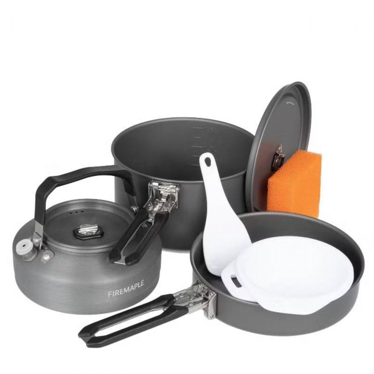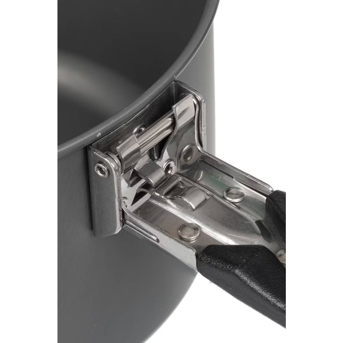 Wszystkie naczynia wykonane są z anodowanego i utwardzanego aluminium, co sprawia, że są one wyjątkowo trwałe i łatwe w utrzymaniu czystości. Uchwytom i uszkom pokrywek wykonanym z tworzywa izolującego od gorącego metalu zawdzięczamy komfort termiczny podczas gotowania. W zestawie znajduje się także łyżka do smażenia, dwie miseczki i gąbka do czyszczenia. Wszystko to można z łatwością spakować w dołączony pokrowiec transportowy, co ułatwia przenoszenie i przechowywanie.