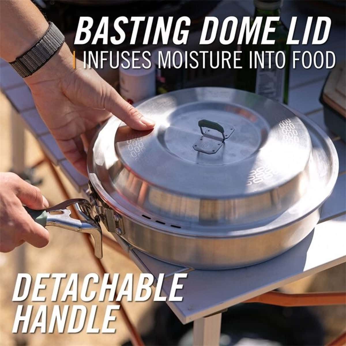 - Patelnia ze stali nierdzewnej o pojemności 2,6 litra i średnicy 25 cm, z odłączanym uchwytem z powłoką silikonową.