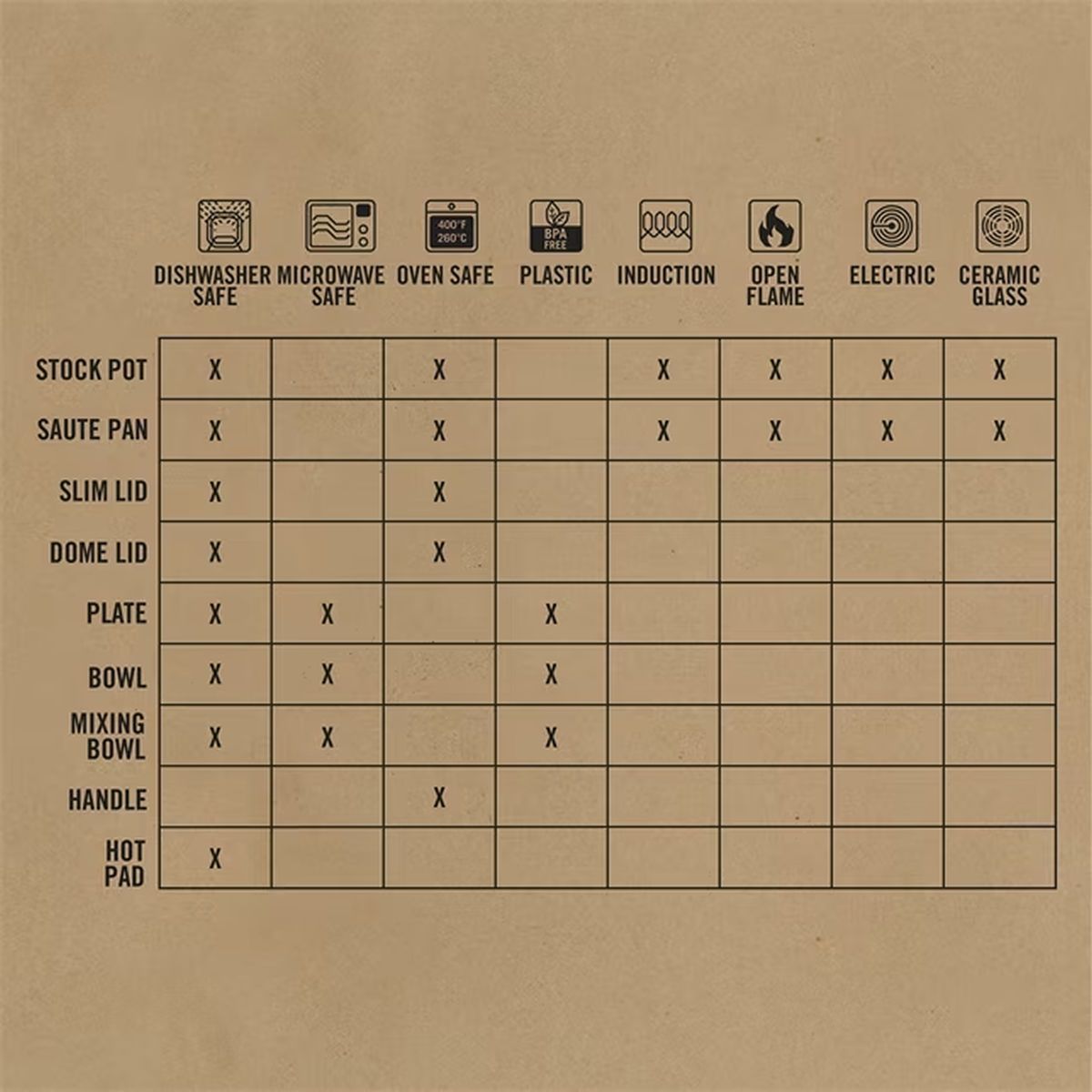 - Patelnia i garnek mogą być używane na płytach indukcyjnych, elektrycznych, ceramicznych oraz na otwartym ogniu.