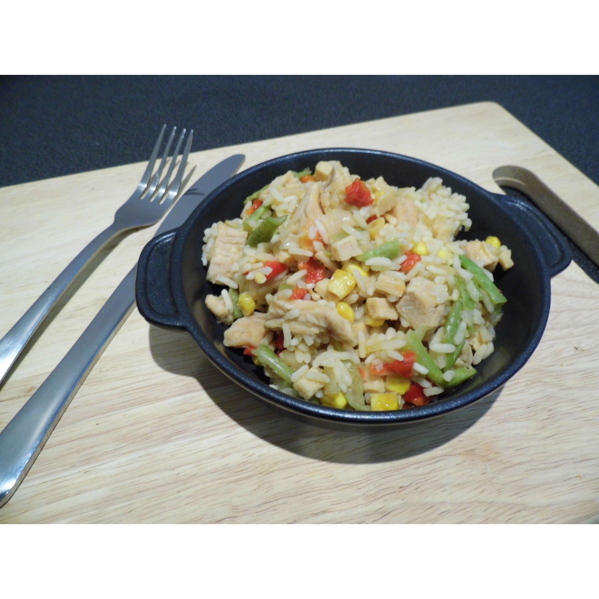 Skład: ryż długoziarnisty (30%), gotowany kurczak (11%), cebula (11%), czerwona papryka (7%), zielona fasolka szparagowa (7%), kukurydza (7%), olej rzepakowy, kawałki omleta (4%), czosnek, sos Teryaki (sos sojowy (woda, sól, niemodyfikowana soja, prażona pszenica, cukier), cukier, ocet spirytusowy, imbir, sól, czosnek, skrobia modyfikowana), sól, biały pieprz.