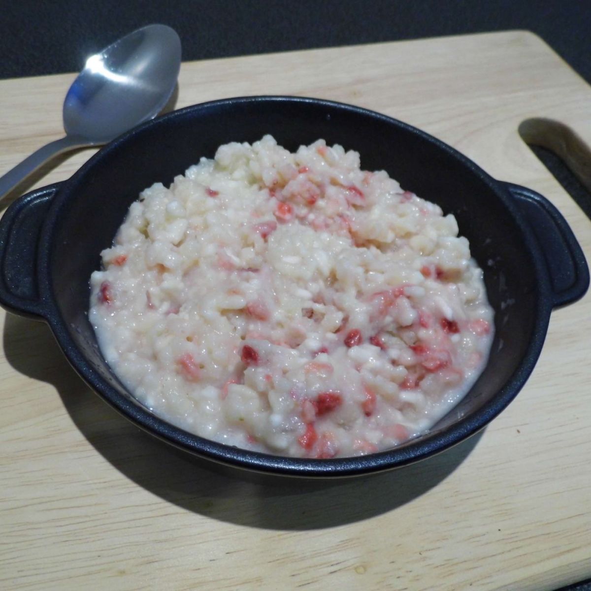 Skład: biały ryż długoziarnisty (77%), śmietanka, pełne mleko, cukier, ryż brązowy, kawałki truskawek (1%).